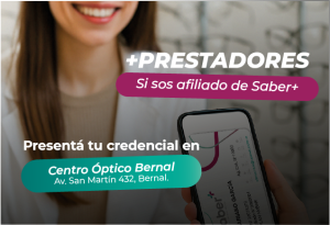 ¡Nuevos beneficios en Centro Óptico Bernal! 👓 Presentando tu credencial de SABER+, accedés a una atención preferencial y descuentos exclusivos en Centro Óptico Bernal. Incluye:•
